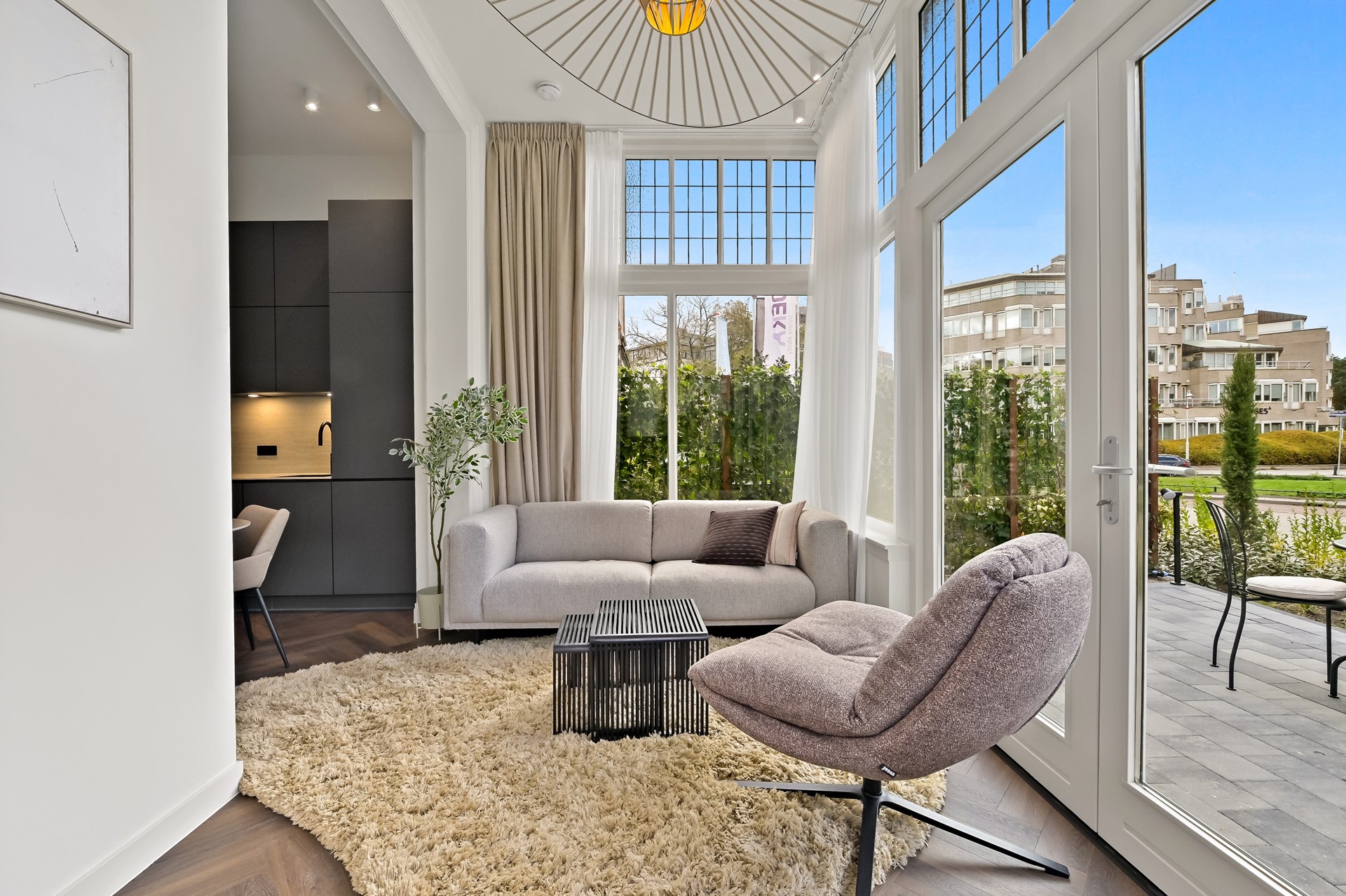 This beautiful studio apartment is located on the ground floor. The entrance is accessible via the central main door of the impressive building. Front door with hallway. Access to the kitchen, which is fully equipped with a dishwasher, induction cooktop, fridge-freezer combination, Quooker for instant boiling water, and ample storage space. From the kitchen, access to the stunning bathroom featuring a bathtub, walk-in shower, vanity with mirror (with lighting and heating), and two towel radiators. Separate toilet in the same style as the bathroom. The kitchen flows into the beautifully renovated living and dining room with herringbone flooring and double French doors opening onto the spacious terrace. From the living room, access to the comfortable bedroom (approx. 8m2). Thanks to the high ceilings and large windows, the apartment feels bright and luxurious. Spacious east-facing backyard of approximately 30m2.