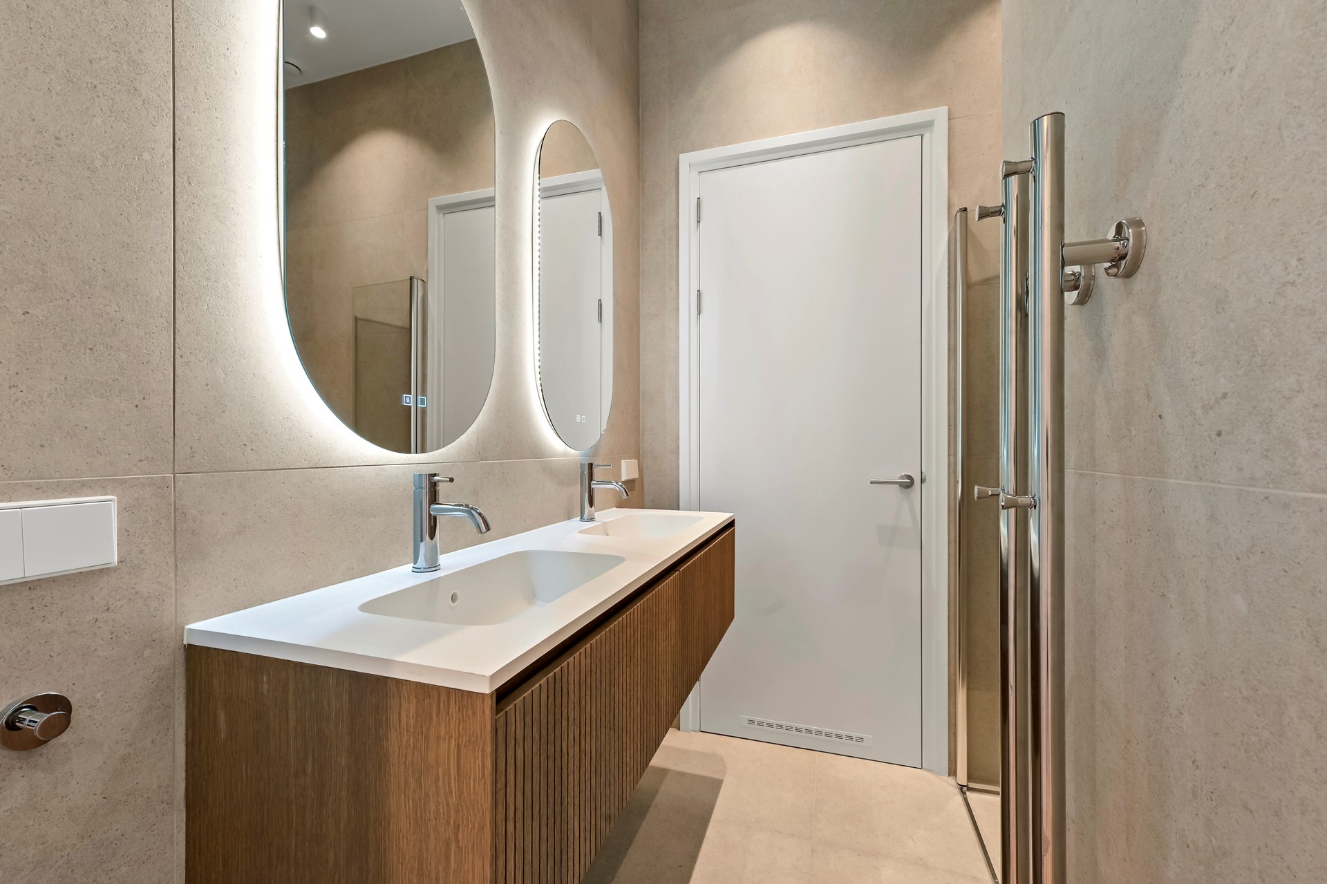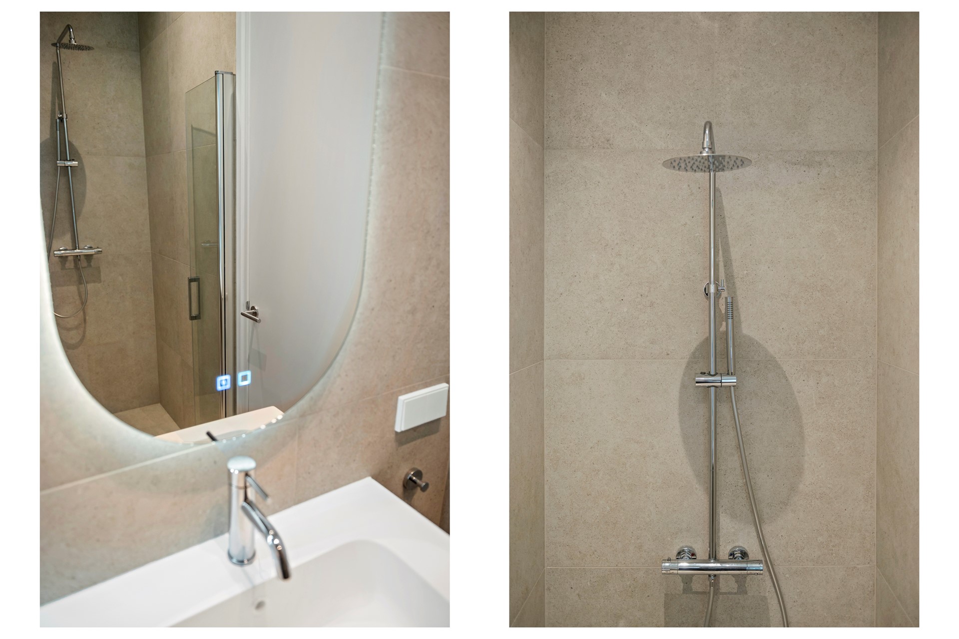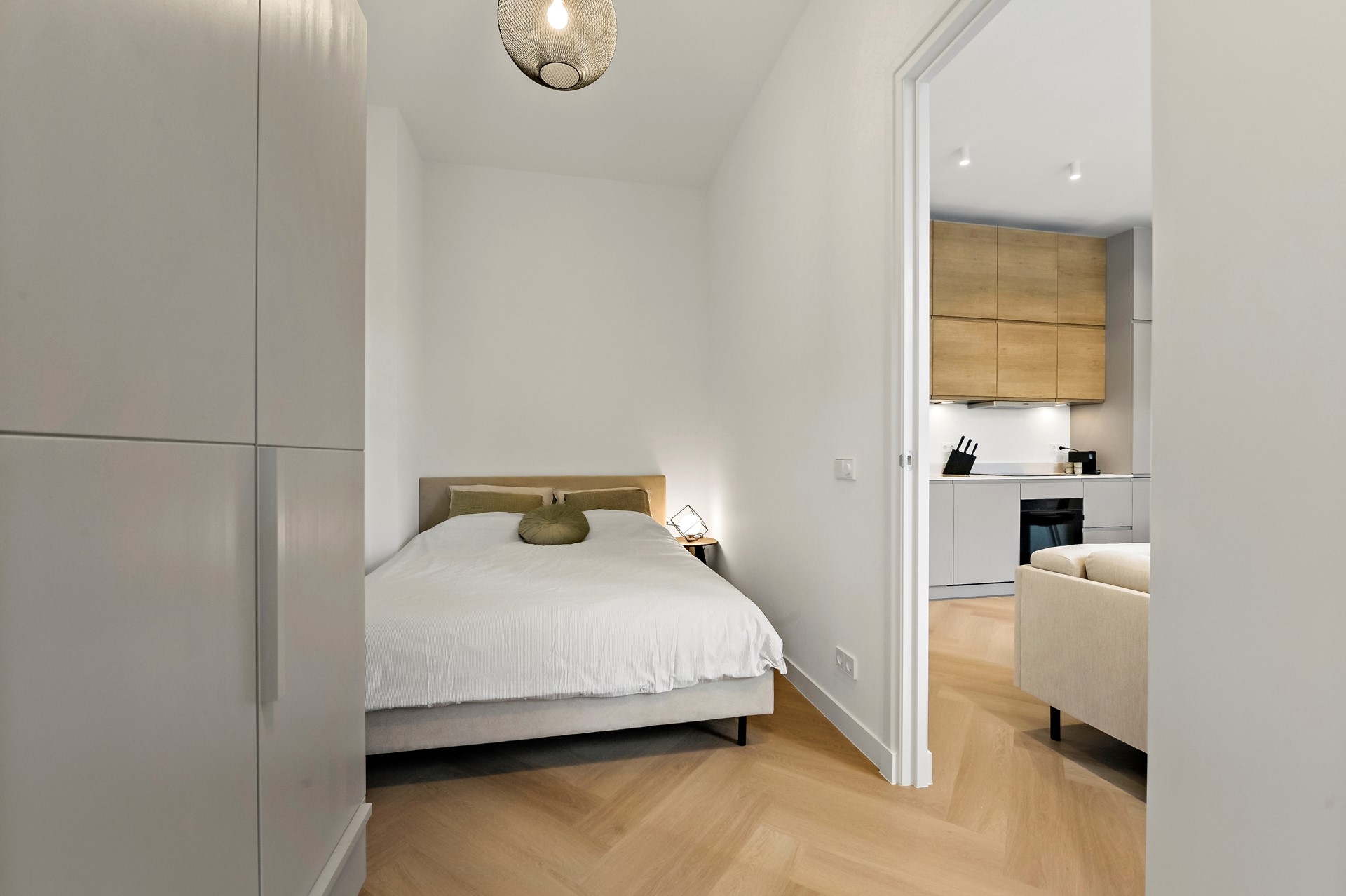 Aan de zijkant van het appartement is de ruime slaapkamer gelegen voorzien van een tweepersoonsbed en een handige kast. Via de slaapkamer kan het balkon bereikt worden. Terug in de hal toegang tot het toilet en de badkamer. De badkamer is voorzien van een inloopdouche, een dubbele wastafel en twee (verwarmde) spiegels met verlichting. Eveneens is via de slaapkamer de handige berging te bereiken.